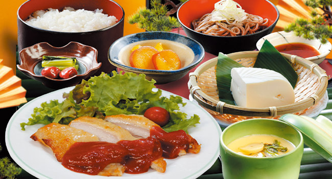 蓼科豚冷しゃぶ(ごまだれ)、信州そば、お豆腐、炊き込みご飯、お漬物、季節の小鉢